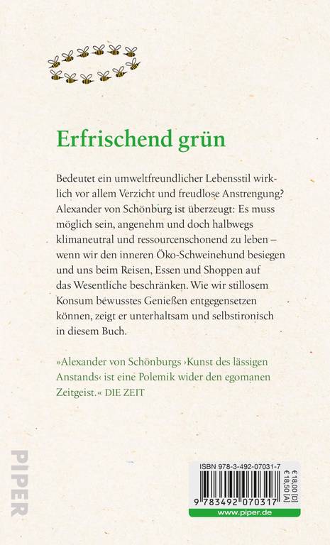Bedeutet ein umweltfreundlicher Lebensstil wirklich vor allem Verzicht und freudlose Anstrengung? Alexander von Schönburg ist überzeugt: Es muss möglich sein, angenehm und doch halbwegs klimaneutral und ressourcenschonend zu leben – wenn wir den inneren Öko-Schweinehund besiegen und uns beim Reisen, Essen und Shoppen auf das Wesentliche beschränken. Wie wir stillosem Konsum bewusstes Genießen entgegensetzen können, zeigt er unterhaltsam und selbstironisch in diesem Buch.