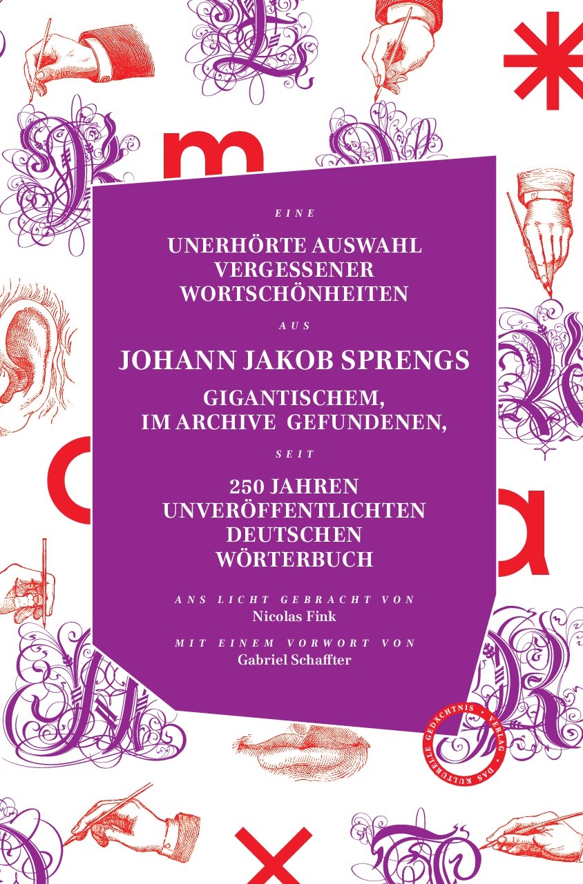 Die damals größte Sammlung deutscher Wörter war fast druckfertig. Wahrscheinlich hätte sie, wäre sie je gedruckt worden, die deutsche Sprache verändert – denn im „Spreng“ findet sich eine Unzahl höchstungewöhnlicher und heute nicht gebräuchlicher Wörter, die zum Teil selbst im Grimm’schen Wörterbuch nicht zu finden sind – die aber oft sehr einleuchtend, sinnfällig und nicht selten von irisierender Schönheit sind. Nicolas Fink ist in die Tiefen der Basler Archive getaucht und hat aus zigtausenden Einträgen die sinnfälligsten, schönsten und neubelebenswertesten Wörter (nebst Spreng’schen Erläuterungen) herausgesucht, transkribiert und zusammengestellt. Die Erstveröffentlichung stellt