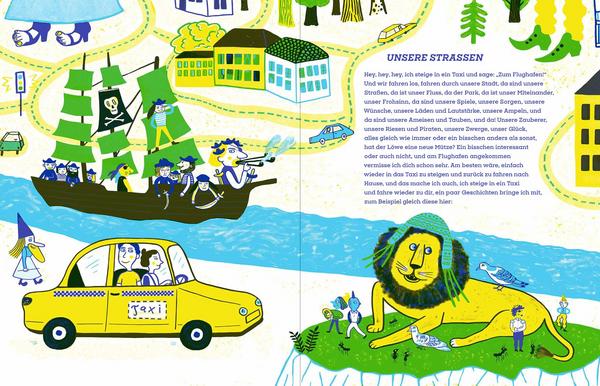 Was, wenn die Magie noch weiter reichte? Wenn Taxis Geschichten anlockten, phantastische und absurde Geschichten, lustige Geschichten, bevölkert von Mensch und Tier und Riese und Piratenkapitän mit vier Piratenkapitänsmützen? Wenn Taxis also Einfallstore wären für die Fantasie der Kinder?