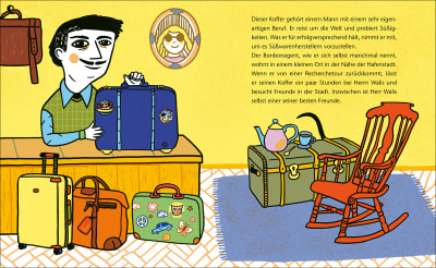 In der Gepäckaufbewahrung von Herrn Walis gehen Menschen aus aller Welt ein und aus. Manchen begegnet Herr Walis nur einmal, andere sind inzwischen zu guten Freunden geworden. Und Herr Walis ist immer wieder erstaunt, was sich alles in den Koffern verbirgt. Einer ist zum Beispiel voller Süßigkeiten – welcher Naschkatze mag der wohl gehören? Könnte eine Geheimagentin die Besitzerin des geheimnisvollen Koffers sein, der nie wieder abgeholt wurde? Und wieso hüpft eines Tages sogar eine Katze aus einem der Koffer?
