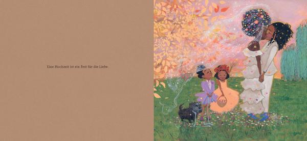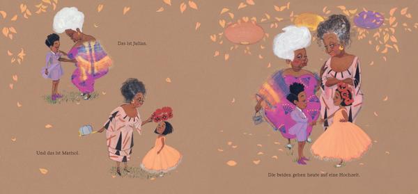 Julian und seine Großmutter gehen auf eine Hochzeit, und Julian darf sogar Blumenkind sein! Auf Hochzeiten gibt es Blumen und Küsse und Tanz und Torten. Und diese Hochzeit hält sogar eine neue Freundin bereit: Marisol. Die beiden Bräute haben einen Hund mitgebracht, mit dem Marisol spielt, während sich Julian in ein Feenschloss träumt. Als Marisols schönes Kleid vom Herumtollen mit dem Hund ganz fleckig ist, hat Julian eine tolle Idee, um ihr zu helfen. Und zum Glück akzeptiert auch Marisols Großmutter die beiden genauso, wie sie sind.