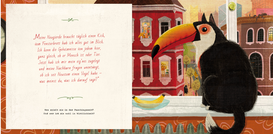 Der Gimpel entdeckt eines Morgens ein Plakat mit einer Ankündigung zum Karneval der Tiere – und das beste Kostüm wird prämiert! Die Nachricht verbreitet sich wie ein Lauffeuer im ganzen Tierreich. Mit Feuereifer werden tierische Verkleidungen gebastelt und mit Fell und Federn geschmückt. Die Wirkung ist verblüffend! Jedes Tier gibt in lustigen Reimen Tipps zu seiner wahren Identität und zu der des Artgenossen, als der es sich verkleidet hat. Errätst du, wer sich als welches Tier verkleidet hat? Und wem gebührt der Pokal für das beste Kostüm? Du entscheidest!