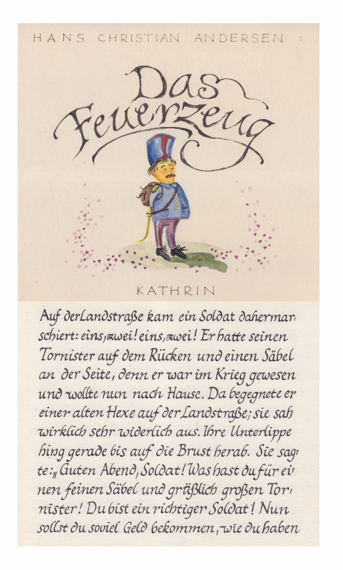 Kat Menschik hat einige sehr bekannte Lieblingsmärchen ausgesucht, aber auch ungewöhnliche, wie Die Schnecke und die Rosenhecke. Die frühesten Illustrationen dieses Bandes entstanden, als sie ihr erstes Buch machte: Als 16-Jährige illustrierte sie für ihre Mutter Das Feuerzeug und band das Ganze als Buch (Auflage: 1 Exemplar).