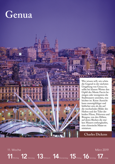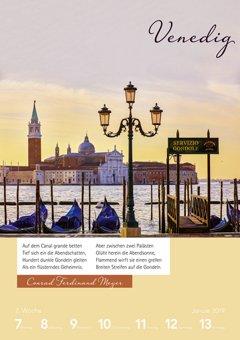 Es gibt Orte auf der Welt, die einen nicht mehr loslassen. Viele bedeutende Kulturschaffende haben ihre persönlichen Gedanken zu diesen Landstrichen und Städten sowie ihre anhaltende Sehnsucht danach in berührende Worte gefasst. Dieser Kalender verbindet ihre Gedichte und Zitate mit passenden Bildern in einem Streifzug um die Welt.