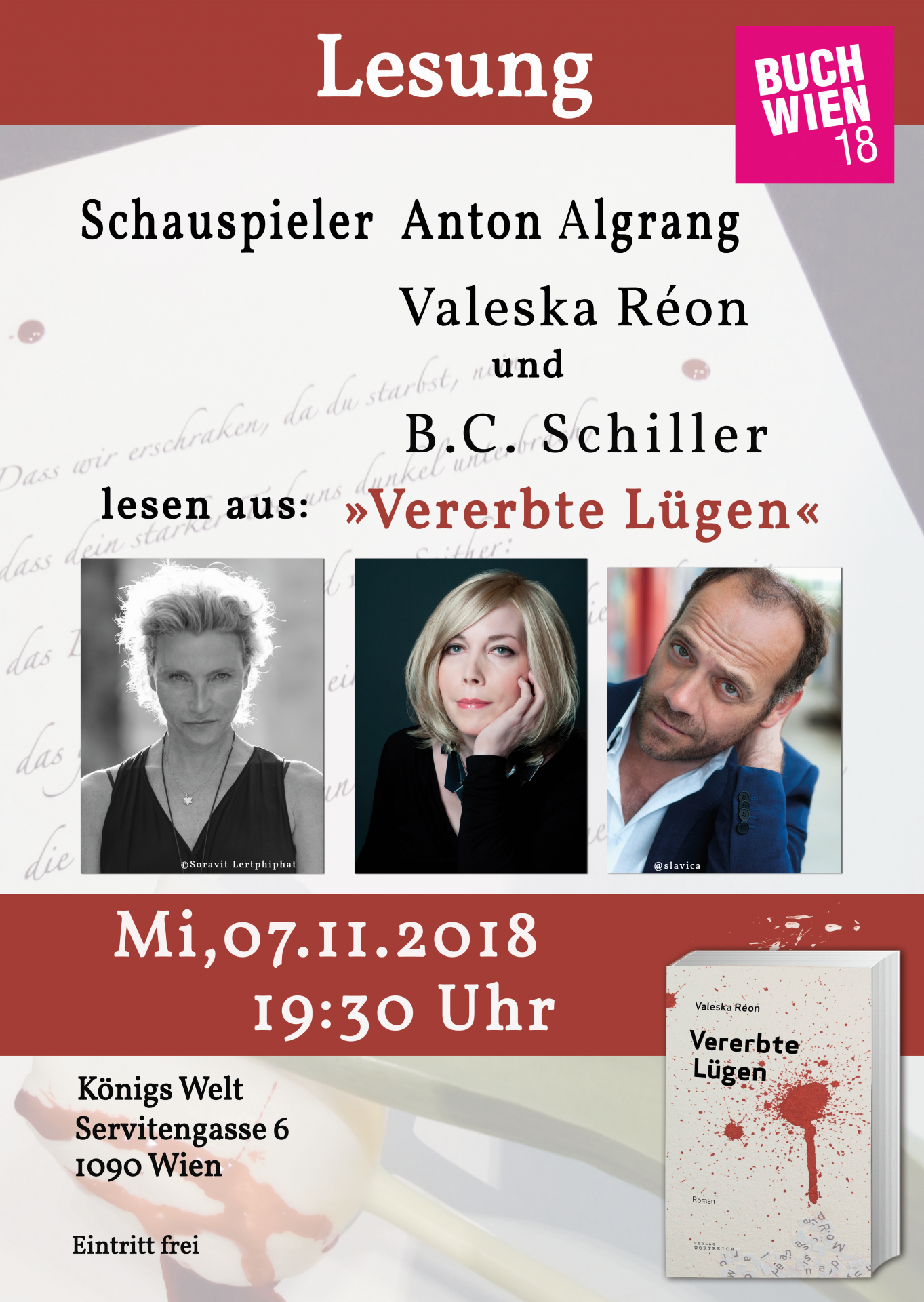 « Alle Veranstaltungen Diese Veranstaltung hat bereits stattgefunden. Szenische Lesung “Vererbte Lügen” im Rahmen der Buch Wien 7. November 2018 @ 19:30 - 21:00 kostenlos « Lesung Anne Goldmann aus “Das größere Verbrechen” Literaturpreis OHRENSCHMAUS » teilen teilen twittern merken mitteilen teilen teilen e-mail info + zu Google Kalender hinzufügen+ Exportiere iCal Details Datum: 7. November 2018 Zeit: 19:30 - 21:00 Eintritt: kostenlos Veranstaltung-Tags:Lesung Veranstalter Buchhandlung beim Augarten Telefon: 01-2392543 E-Mail: lesung@beimaugarten.at Website: www.buchhandlungbeimaugarten.at Veranstaltungsort Königs Welt Servitengasse 6 Wien, Wien 1090 Österreich + Google Karte